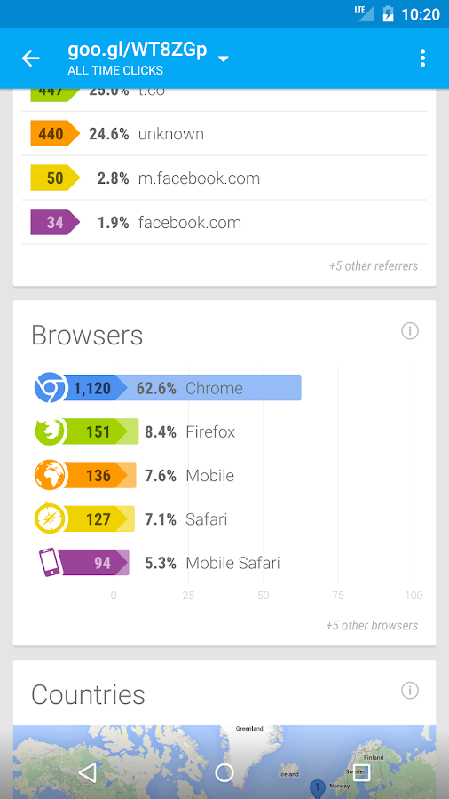 Gli short link via via memorizzati saranno disponibili per lungo tempo e, cliccando sull’area occupata da ognuno, potremmo accedere alle statistiche riguardanti il relativo URL, quali la quantità di click totalizzati, la loro provenienza (Twitter, Facebook, etc.) e le caratteristiche degli utenti che hanno cliccato (browser, sistema operativo, Paese di provenienza, etc.).